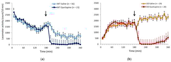 Changes in locomotor activity induced by 20 mg/kg quetiapine. (a,b) Changes in locomotor activity in (a) WT and (b) DD mice following quetiapine and saline administration. The arrows indicate the drug injection time. ** p < 0.01, *** p < 0.001, compared with saline (Student’s t-test). The graphs show the number of animals per group. The data are expressed as mean ± SEM. WT, wildtype mice; DD, dopamine-deficient mice.