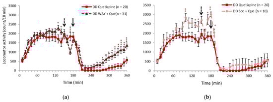 Effects of quetiapine on locomotor activity when 5-HT1A and cholinergic receptor activity is suppressed. (a,b) Changes in locomotor activity induced by (a) 1 mg/kg WAY100635 and (b) scopolamine in DD mice 30 min before quetiapine administration. The solid arrows indicate the quetiapine injection time. The dashed arrows indicate the WAY100635 and scopolamine injection time. * p < 0.05, ** p < 0.01, *** p < 0.001, compared with quetiapine (Student’s t-test). The graphs show the number of animals per group. The data are expressed as mean ± SEM. 5-HT, 5-hydroxytryptamine (serotonin); DD, dopamine-deficient mice.