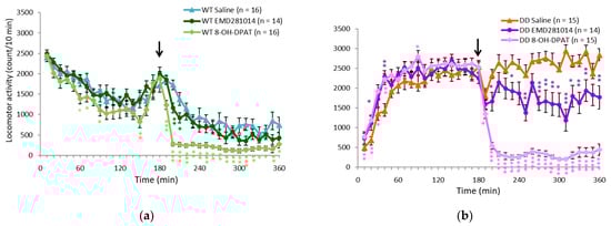 Different effects of 5-HT and 5-HT2A receptor activation on hyperactivity in DD mice. (a,b) Changes in locomotor activity in (a) WT and (b) DD mice after EMD281014 (5-HT2A receptor antagonist) and 8-OH-DPAT (5-HT1A receptor agonist) administration. The arrows indicate the drug administration time. * p < 0.05, ** p < 0.01, *** p < 0.001, compared with saline (Student’s t-test). The graphs show the number of animals per group. The data are expressed as mean ± SEM. WT, wildtype mice; DD, dopamine-deficient mice; 8-OH-DPAT, 8-hydroxy-2-dipropylaminotetralin hydrobromide.
