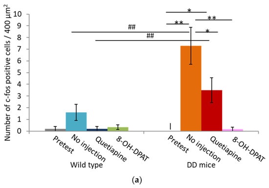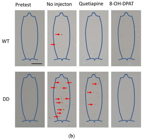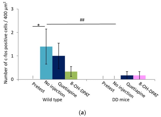 One limitation of this study is that c-Fos is an indirect marker of neuronal activity because it is expressed after action potentials spike in neurons []. The appearance of c-Fos-positive cells that is attributable various nonspecific causes should also be considered. Future studies, such as calcium imaging, will be required to analyze neuronal activity more precisely. Additionally, both DD mice and wildtype mice exhibited a decrease in locomotor activity in the novel environment when they were treated with quetiapine and 8-OH-DPAT. Therefore, it is unknown whether quetiapine and 8-OH-DPAT specifically suppressed hyperlocomotion in DD mice.