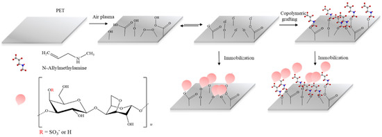 Schematic representation of plasma postirradiation grafting of N-allylmethylamine onto a PET surface followed by immobilization of FUR or κ-CA polysaccharide.