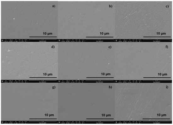 The surface morphology of each sample was monitored by a NANOSEM 450 (FEI, Thermo Fisher Scientific, Hillsboro, OR, USA) scanning electron microscope operated at 5 kV with an Everhart–Thomley detector (ETD). The images were obtained at a magnification of 20,000×. The samples were coated with Au/Pt prior to observation.