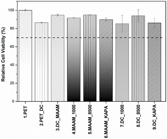 The cytotoxicity of individual samples was evaluated using a mouse embryonic fibroblast cell line (NIH/3T3) according to the ISO 10993-5 standard. Cytotoxicity tests are the first option when the biocompatibility of materials, including polymers, is assessed. Measurements were performed in triplicate with untreated PET as a reference. Error bars represent standard deviations. Figure 3 shows that all values obtained from the relative cytotoxicity test were above 80%. Overall, the cell viability of samples functionalized with MAAM and polysaccharides (FUR, κ-CA) increased in comparison with samples treated only with plasma, and all materials can be considered nontoxic. This was also confirmed in Figure 4a–i, where cells were growing homogeneously, and all samples were assigned as cytocompatible. The biological response to any material is affected by its various surface properties. Hydrophobicity, roughness, homogeneity or functional groups belong to important factors affecting cell adhesion and proliferation. Many studies indicated that cells tended to attach to hydrophilic surfaces [44]. On the other side, it has been reported that cells adhered and proliferated at the highest rate when cultured on a hydrophobic surface or a contact angle of around 70 degrees [53]. This may be the explanation for why untreated PET showed the best proliferation results. As expected, the cell proliferation effect of furcellaran coated samples is consistent with previous studies of other seaweed polysaccharides [54,55,56].