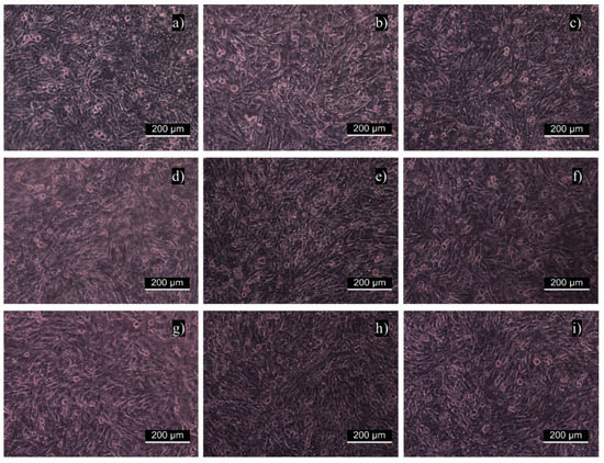 Fibroblast proliferation on examined samples: (a) untreated PET, (b) PET_DC, (c) DC_MAAM, (d) MAAM_1000, (e) MAAM_8500, (f) MAAM_KAPA, (g) DC_1000, (h) DC_8500 and (i) DC_KAPA.
