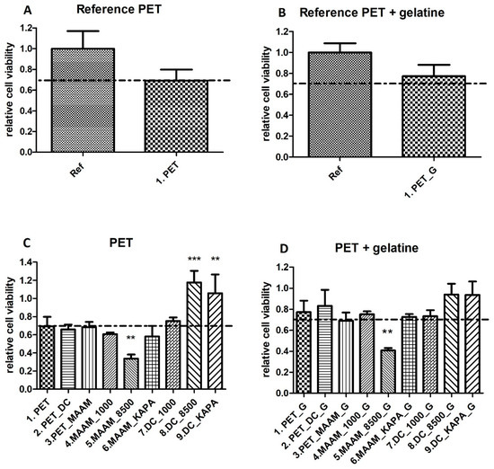 Cell viability of individual samples. The dashed line highlights the limit of viability according to EN ISO 10993-5: viability < 0.7 corresponds to a cytotoxic effect. (A) Comparison of reference (cells on TPP plastic) and PET; (B) Comparison of reference (cells on TPP plastic coated with gelatine) and PET coated with gelatine; (C) Comparison of PET as a reference and samples; (D) Comparison of PET coated with gelatine as a reference and samples also coated with gelatine. Data are reported as the means and standard deviations from a minimum of four independent experiments. To determine significant differences between samples ANOVA with post hoc Tukey’s Multiple Comparison test was used; ** p < 0.01, *** p < 0.001.
