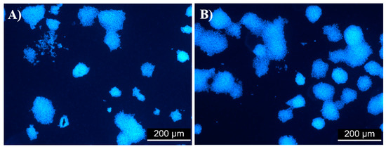 Mouse embryonic cells (Line R1) on (A) PET uncoated with 0.1% gelatine and (B) DC 8500 uncoated with 0.1% gelatine after 120 h of cultivation.