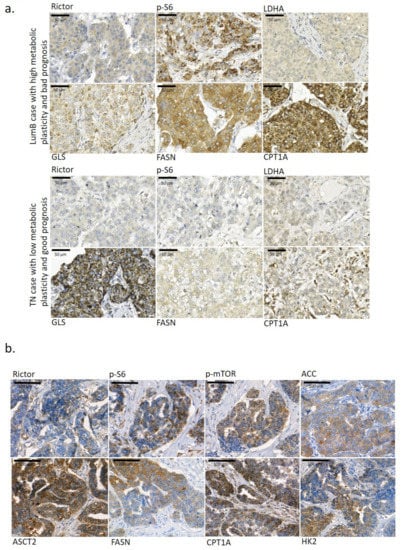 Metabolic enzyme expression heterogeneity in the studied breast cancer tissues. (a) Metabolic plasticity in tumour tissue and its importance in the overall survival of breast cancer patients. Two breast cancer cases with different metabolic plasticity at the tissue level—the Luminal B (LumB) case with high metabolic plasticity (based on Rictor, p-S6, GLS, FASN and CPT1A IHC staining and their high staining intensity) had a short overall survival of only 14 months; however, in another triple-negative breast cancer (TN) case with low metabolic plasticity, a much longer overall survival period was observed (201 months). High metabolic plasticity was considered if high mTOR activity was accompanied with intensive staining of a minimum of two studied metabolism-related enzymes. (b) Representative staining of several metabolic enzymes (Rictor, p-S6, p-mTOR, ACC—acetyl-CoA carboxylase, ASCT2—alanine, serine, cysteine-preferring transporter 2, FASN—fatty acid synthase, CPT1A—carnitine palmitoyltransferase 1A, and HK2—hexokinase 2) showed high tissue heterogeneity in the studied breast cancer cases. 3,3′-diaminobenzidine (DAB) (brown) was used as a chromogen. Scale bars are given in the figures.
