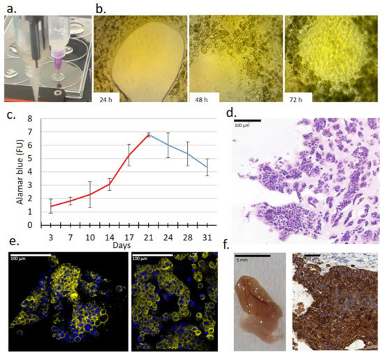 In our recent study, we established a new 3D culturing method using 3D bioprinted ZR75.1 TMSs grown in vitro, and compared the detected sensitivity to other models (2D cell culture, 3D spheroids in ULA plates and in vivo xenografts) treated by rapamycin, doxycycline, doxorubicin and their combinations. For 3D bioprinting, alginate-based cell-free scaffolds and hydrogels containing ZR75.1 cells were printed as separate layers (Figure 3a,b). These gel compositions were selected based on a previous publication [42]. The time-dependent cellular growth of ZR75.1 cells was followed after 3, 7 or 10 days, or longer, of culturing (Figure 3c). TMSs were used freshly or fixed and several morphology studies were carried out. The 10/14-day-old TMSs showed morphological similarities to tissue sections based on haematoxylin–eosin (H&E) staining. Additionally, luminal structures formed in printed and cultured TMSs were detected with confocal microscopic observations (using phalloidin and DAPI staining) (Figure 3d,e, Video S1). The tumourigenecity of the printed TMSs was also tested. The xenotransplanted TMSs started to grow and their vascularisation was also found in SCID mice. The TMSs grown in vivo preserved their human BC origin, which was confirmed by IHC (e.g., human cytokeratin expression) after 1–2 months of growing (Figure 3f).