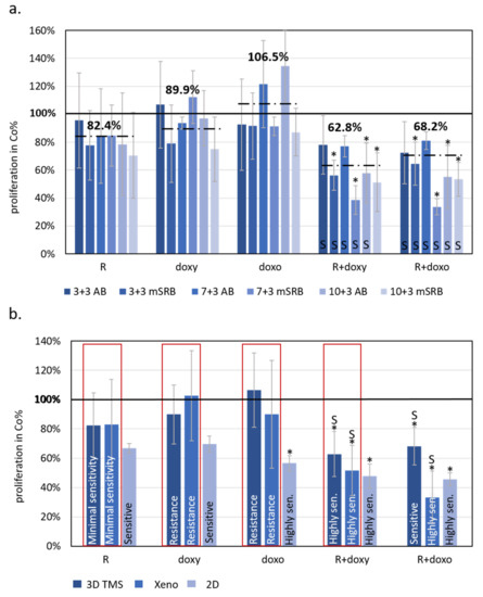 The effects of rapamycin, doxycycline and doxorubicin treatments showed similarities to 3D bioprinted TMSs grown in vitro and in vivo xenograft models of ZR75.1 breast cancer cells. (a) Alamar blue (AB) and modified sulforhodamine B (mSRB) assays were applied to follow the time-dependent sensitivity differences of ZR75.1 3D bioprinted tissue-mimetic scaffolds (TMSs) after rapamycin, doxycycline and doxorubicin mono- and combination treatments. The treatment period was 72 h after 3/7/10-day pre-culturing (3 + 3, 7 + 3 and 10 + 3, respectively). Dashed lines show average viability in control % calculated from the three different starting points and two different proliferation tests (six for each different drug treatment). (b) Compared results of the treatment responses in 2D, 3D bioprinted and xenografted ZR75.1 cells. Red frame shows the similarities of the sensitivity of the studied 3D bioprinted ZR75.1 TMSs (3D TMS) and xenografts (Xeno). The bars represent the average results from the performed experiments and analyses given in control % (thick black line—100%), and the sensitivity evaluation is also indicated in the chart. Sensitivity evaluation was given based on the altered proliferation: resistance ~90%; minimal sensitivity > 80%; sensitive 60–80%; highly sensitive < 60%. (Co—control; R—rapamycin/Rapamune, 50 ng/mL–3 mg/kg; doxy—doxycycline, 10 µM–5 mg/kg; doxo—doxorubicin, 50 ng/mL–2 mg/kg). Synergistic treatment interaction is labelled with S (based on combination index calculation). * p < 0.05.