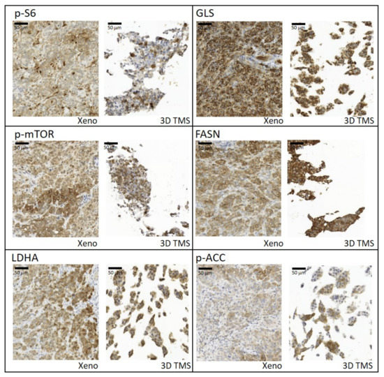 Tissue heterogeneity of metabolic enzyme expression and similarities between xenografts (Xeno) and 3D bioprinted tissue-mimetic scaffolds (3D TMS) of ZR75.1 cells. Immunostainings with anti-p-S6, -GLS, -p-mTOR, -FASN (fatty acid synthase), -LDHA (lactate dehydrogenase A), and -p-ACC (acetyl-CoA carboxylase) antibodies using 3,3′-diaminobenzidine (DAB) (brown) chromogen and haematoxylin counterstaining. Scale bar is given in the first figure.