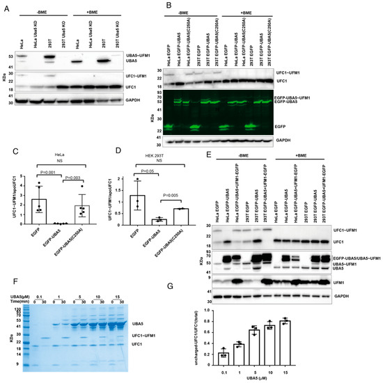 HeLa cells were transfected with EGFP, EGFP-UBA5, EGFP-UBA5 (C250A), EGFP-UFC1 and EGFP-UFC1(C116A) plasmid and Transporter 5 reagent separately. At 24 h after transfection, cells were harvested in Bis-Tris lysis buffer. Total protein concentration of each cell lysate was measured as above. A total of 20 µg of protein for each cell lysate was loaded on a 12% Bis-Tris SDS-PAGE gel with 1× sample buffer with and without β-mercaptoethanol (BME; Sigma Aldrich M6250). Gels were imaged using the ChemiDoc MP Imaging system (Bio-Rad, Hercules, CA, USA).
