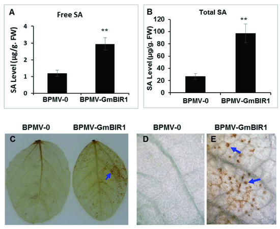 SA is a key hormone that positively regulates defense responses against biotrophic pathogens and is over-accumulated in the plants with activated defense responses [20,28]. To examine whether SA over-accumulation occurred in GmBIR1-silenced plants, both free SA and bound SA were quantified, and the levels of free SA and bound SA were 2.46- and 4.1-fold higher in the GmBIR1-silenced plants than in BPMV-0 control plants, respectively (Figure 2A,B). The over-accumulated level of SA suggests that SA is involved in the constitutively activated defense responses observed in GmBIR1-silenced plants.