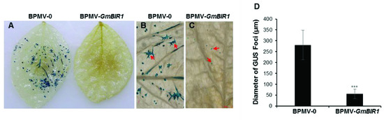 At 18 dpi with BPMV vector only (BPMV-0) or BPMV-GmBIR1 constructs, second fully expanded soybean trifoliolate leaves counting from the top were detached and biolistically inoculated with SMV-N-GUS [33,48]. Following SMV-N-GUS inoculation, the detached leaves were put into petri dishes with moist filter papers and kept on a lighted growth shelf for 5 days before GUS staining. GUS staining was performed as described by [52]. Photographs of the leaves with GUS foci were taken using a stereo microscope (Olympus SZH10, Center Valley, PA, USA). The numbers of GUS foci were counted, and the diameters of GUS foci were measured using Soft Image System analysis (IA Package; Olympus).