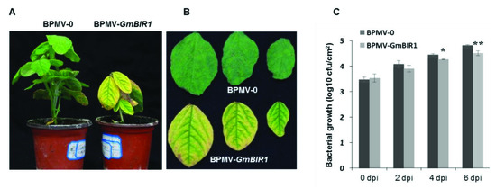 BPMV strains, BPMV VIGS constructs, and inoculation of soybean seedlings with DNA-based BPMV constructs via biolistic particle bombardments using a Biolistic PDS-1000/He system (Bio-Rad Laboratories, Hercules, CA, USA) have been described previously [48]. The orthologs of ArabidopsisBIR1 in the soybean genome were identified by BLASTN in phytozome databases. The primers used for construction of the BPMV-GmBIR1 (Glyma.18g246400.1) are: