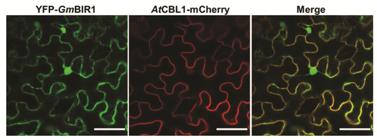 RLKs normally function at the PM. To investigate the subcellular location of GmBIR1, the full-length GmBIR1a was fused to the C-terminus of GFP and transiently co-expressed in N. benthamiana leaves with a PM marker, AtCBL1-mCherry, via agroinfiltration. As shown in Figure 5 and Figure 6, GFP-GmBIR1 was not only co-localized with AtCBL1-mCherry but also presented in the nucleus, indicating that GmBIR1 has dual subcellular localizations at the PM and in the nucleus.