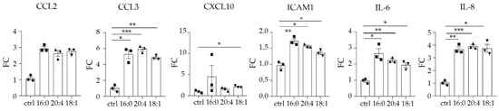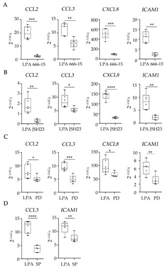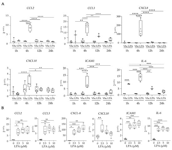 2.5. LPA Induces the Expression of the Secreted Factors CCL2, CCL3, CXCL10, ICAM1, IL-6, and IL-8 at the mRNA Level in HKC-8 Cells