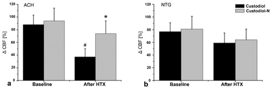 | CBF [mL/min] | 19.3 ± 2.5 | 39.4 ± 4.7 * | 21 ± 3 | 40 ± 3 * | 35 ± 6 | 43 ± 7 |