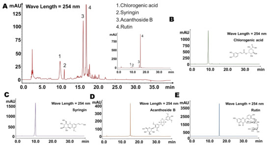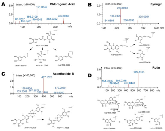 Next, we identified these four main chromatographic peaks using high-resolution mass spectrometry (LC/MSn-IT-TOF) (Table 1, Figure 2). The mass spectrum of peak 1 and the fragmentation pathway are shown in Figure 2A. The molecular formula of peak 1 was C16H18O9, with the molecular ion of [M − H]−, and m/z of 353.0866. From the high-resolution mass spectra obtained by IT-TOF, we made the following summary of its mass spectral cleavage pathway. The ion with m/z of 191.0549 was generated from the cleavage of the ester bond by the molecular ion ([M − H-C9H6O3]−, m/z = 191.0549). The subsequent ion with m/z of 179.0349 was the product of ions obtained when the molecular ion lost 1 quinicacid group ([M − H-C7H10O5]−, m/z = 179.0349) [29], and the latter continued to lose 1 COO to obtain an ion with m/z = 135.0481([M − H-C7H10O5-COO]−) [29]. Based on peak 1 and its molecular weight and mass spectral fragmentation pathway, and further comparison with the standard substances, we believe that peak 1 was chlorogenic acid [29]. The mass spectrum of peak 2 and the fragmentation pathway are shown in Figure 2B. The molecular formula of peak 2 was C17H24O9, with the molecular ion of [M + Na]+, and m/z of 395.0954 [30]. From the high-resolution mass spectra obtained by IT-TOF, we made the following summary of its mass fragmentation. The ion with m/z of 233.0781 was generated from the loss of 1 glucose from the molecular ion (M + Na+-C6H10O5, m/z = 233.0781). The subsequent ion with m/z of 185.0436 was the product of ions produced by the molecular ion cleaving the ether bond and then losing 2H (M + Na+-C11H14O4, m/z = 185.0436). Based on peak 2 and its molecular weight and mass spectral fragmentation pathway, and further comparison with the standard substance, we conjectured that peak 2 was syringin [30]. Next, we analyzed the mass spectrum of peak 3 as well as the fragmentation pathway (Figure 2C). The molecular formula of peak 3 was C28H36O13, and the molecular ion was [M − H]− with m/z of 579.2039. From the high-resolution mass spectra obtained by IT-TOF, we made the following summary of its mass spectral cleavage pathway. The ion with m/z of 417.1528 was obtained from the loss of 1 glucose from the molecular ion ([M − H-C6H10O5]−, m/z = 417.1528) [31]. Based on peak 3 and its molecular weight and mass spectral fragmentation pathway, and further comparison with the standard substance, we confirmed that peak 3 was acanthoside B [31]. Finally, we analyzed the mass spectrum of peak 4 as well as the fragmentation pathway (Figure 2D). The molecular formula of peak 4 was C27H30O16, and the molecular ion was [M − H]− with m/z of 609.1454. From the high-resolution mass spectra obtained by IT-TOF, we make the following summary of its mass fragmentation pathway. The ion with m/z of 463.0440 was produced by losing 1 rhamnose from the molecular ion ([M − H-C6H10O4]−, m/z = 463.0440) [32]. The subsequent ion with m/z of 301.0348 was generated from the loss of 1 glucose in the ion of m/z = 463.0440 ([M − H-C6H10O4-C6H10O5]−, m/z = 301.0348) [33]; the latter continued to lose the B ring on the flavonoid skeleton to generate the ion of [M − H-C6H10O4-C6H10O5-C7H6O2]− with m/z = 178.9948 [32], and the ion with m/z = 178.9948 continued to lose the C ring to produce an ion with m/z = 151.0035 [32]. Based on peak 4 and its molecular weight and mass spectral fragmentation pathway, and further comparison with the standard, we suspected that peak 4 was rutin.