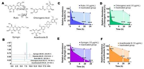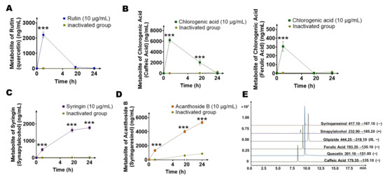 The main metabolites of the rutin, chlorogenic acid, syringin, and acanthoside B found in this study were mainly hydrolyzed products. For example, quercetin was the hydrolyzed product of rutin by loss of rutinose. Caffeic acid was the hydrolyzed product of chlorogenic acid by loss of quinicacid. Sinapylalcohol was the hydrolyzed product of syringin by loss of glucose, and syringaresinol was the hydrolyzed product of acanthoside B by loss of glucose. It has reported that enzymes with hydrolysis activity are widely present in intestinal bacteria. For example, the dominant species in intestinal bacteria, such as Bifidobacteria and Lactobacillus, have related enzyme systems [39]. For non-monoglycosidic compounds, some genera in intestinal bacteria have evolved into enzymes that specifically hydrolyze these glycosidic bonds, such as Lactobacillus acidophilus and other genera that can hydrolyze rhamnosidic bonds by L-rhamnosidase, which can be used for deglycosylation of rutin, isohesperidin, etc. [40,41].