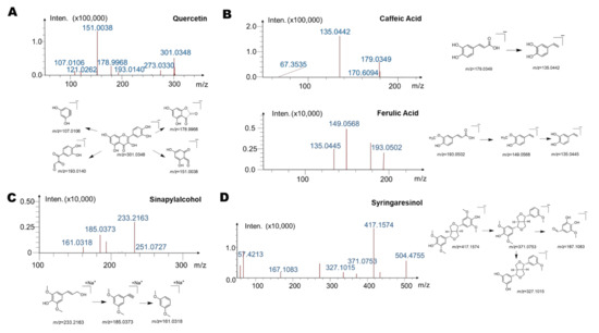 High-resolution mass spectrometry of intestinal bacterial metabolites of four main substances (chlorogenic acid, syringin, acanthoside B, rutin) of Saussurea involucrata. (A) The mass spectral cleavage pathway of quercetin (metabolite of rutin). (B) The mass spectral cleavage pathway of caffeic acid and ferulic acid (metabolites of chlorogenic acid). (C) The mass spectral cleavage pathway of sinapylalcohol (metabolite of syringin). (D) The mass spectral cleavage pathway of syringaresinol (metabolite of acanthoside B).