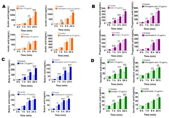 Figure 6A–D shows the effects of the four main components on the production of acetic acid, propionic acid, butyric acid, and isovaleric acid in intestinal bacteria, respectively. As shown in Figure 6A, with the prolongation of incubation time, compared with the control group, it can be found that rutin and chlorogenic acid can significantly increase the content of acetic acid in the incubation system. At 24 h, the acetic acid content in the rutin and chlorogenic acid groups was 1.60 times and 1.40 times that of the control group, respectively. At the same time, syringin group and acanthoside B group had no obvious ability to induce acetic acid. Figure 6B shows the effects of the four main components on the production of propionic acid in intestinal bacteria. Compared with the control group, rutin and chlorogenic acid significantly promoted the production of propionic acid in the incubation system of intestinal bacteria by 41.7% and 16.7%. At the same time, the propionic acid concentration in the syringin group was also increased by 9.5% compared with the control group at 24 h, but there was no obvious difference. However, the acanthoside B group had no obvious ability to induce propionic acid. Next, we tested the butyric acid content in the incubation system. As shown in Figure 6C, compared with the control group, rutin, chlorogenic acid, and acanthoside B could significantly stimulate the synthesis and secretion of butyric acid by intestinal bacteria. At 24 h, the concentration of butyric acid in rutin, chlorogenic acid, and acanthoside B groups increased by 146.3%, 86.4%, and 25.0% respectively, and syringin also promoted the production of butyric acid in the incubation system, but the extent was smaller (16.3% increase at 24 h) and showed no significant difference. Finally, we examined the content of isovaleric acid in each group of incubation systems (Figure 6D). The effects of rutin and syringin on isovaleric acid production were more significant. At 24 h, the content of isovaleric acid in the system increased by 80.0% and 27.9%, respectively, compared with the control group. Chlorogenic acid and acanthoside B also had a certain stimulating effect on isovaleric acid. At 24 h, the content of isovaleric acid in the system increased by 13.1% and 15.9%, respectively.