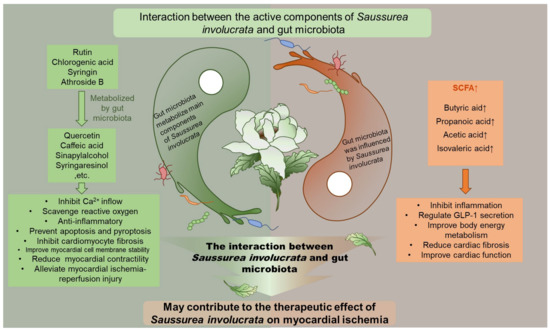 The gut microbiota interacts with the four main components of Saussurea involucrata (chlorogenic acid, syringin, acanthoside B, rutin). First, gut bacteria can metabolize the four main components of Saussurea involucrata (chlorogenic acid, syringin, acanthoside B, rutin) into the corresponding intestinal bacteria metabolites, which have potential therapeutic effects against myocardial ischemia; in addition, the four main components of Saussurea involucrata (chlorogenic acid, syringin, acanthoside B, rutin) can also in turn stimulate the production of short chain fatty acids (acetic acid, propionic acid, butyric acid, isovaleric acid) by intestinal bacteria, which further contributes to the protective effect of Saussurea involucrata against myocardial ischemia.