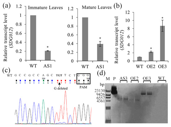 The downregulation and upregulation of SDG102 expression in transgenic maize plants. (a,b) Relative transcript level of SDG102 in the wild-type (WT), SDG102-RNAi line (AS1; (a)), and overexpression line (OE2 and OE3; (b)). Asterisks (*) indicate statistically significant differences between the indicated genotypes and the wild type (p < 0.001). Error bars indicate standard deviation (n = 3). ZmACT1 was used as an internal control. (c) Sequencing results of CRISPR/Cas9-mediated mutations on the SDG102 target site in transgenic plants (AS3). WT represents the sequence of the wild-type. Sequence inside the rectangle is the Protospacer Adjacent Motif (PAM) sequence. (d) Southern blot analysis using DNA extracted from WT, AS3, OE2, and OE3 (M = molecular weight marker; p = probe bar gene).