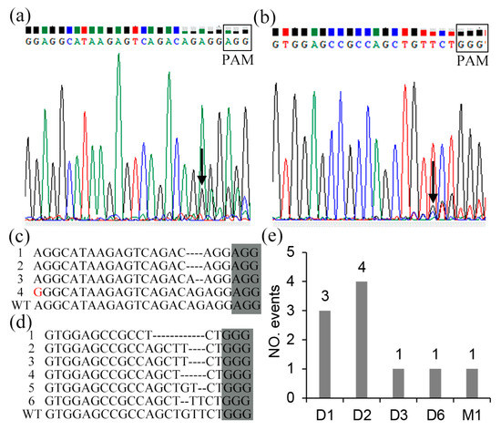 The detection of the CRISPR/Cas9-mediated mutation on the SDG102 target site in protoplast, arrows indicated genomic DNA sequence was edited. (a,b) Direct sequencing of PCR products containing the targeted sites of the third exon and seventh exon, respectively. (c,d) Monoclonal mutation analysis of the targeted sites of the third exon and seventh exon, respectively. (e) Mutation-type analysis (D1 = 1 bp deletion; D2 = 2 bp deletion; D3 = 3 bp deletion; D6 = 6 bp deletion; M1 = nucleotide replacement mutation).