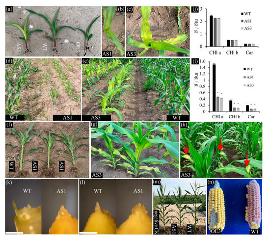 Phenotypic analysis was conducted on BC4-F3 or F3 progenies of homozygous transgenic plants and WT segregant and WT plants, revealing that the perturbation of SDG102 expression causes several developmental defects. Seedlings of both AS1 and OE3 plants germinated normally, but the growth of transgenic plants was slower during the vegetative phase than the WT plants (Figure 3a). AS1 plants produced yellow leaves during the seedling stage. Interestingly, AS3 plants generated more yellow leaves with larger surface areas than AS1 plants (Figure 3b,c). The leaf color of the AS1 and AS3 plants remained yellow at the vegetative-to-reproductive phase transition stage (i.e., V6/V7, which are referred to the seedlings with the sixth or seventh leaf presence, fully extended collars, and the eighth/ninth leaves visible; Figure 3d,e). However, the leaf color of AS1 plants returned to normal and the bottom leaves of the AS3 plants remained yellow at the post-transition (V8) stage (Figure 3f,g). The leaf color of the AS3 plants returned to normal up to the V10 stage, despite a few yellow spots remaining on the bottom leaves (Figure 3h). At the V6 stage, pigment content in yellow leaves of the AS lines showed decreasing to approximately 30–32% of the WT plants (Figure 3i). Once yellow leaves disappeared (i.e., when the plants reached the adult stage and turned completely green), the pigment levels of the AS lines were like those of the WT (Figure 3j). Previous reports have demonstrated that the internal structures of chloroplasts in the yellow sections of leaves are severely disaggregated, which results in a slow growth rate [48].