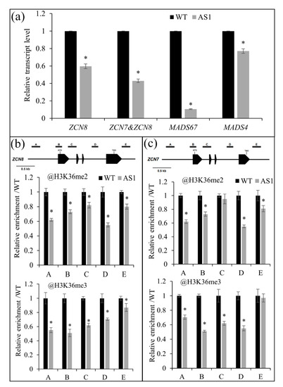 The SDG102-deficient plants displayed a late-flowering phenotype, which prompted us to examine the expression of known maize flowering regulatory genes. RT-qPCR indicated that the key flowering-related genes ZCN8/ZCN7 and MADS4/MADS67 were downregulated in AS1 plants (Figure 4a). The FT-like ZCN8 and its close paralog ZCN7 are key genes in controlling the flowering time in maize. Their proteins are produced in leaves and move to the shoot apex to promote MADS4 and MADS67 by interacting with DLF1, ultimately regulating the flowering time [9,10,11,15]. To obtain insights into the molecular mechanism underlying the downregulation of flowering genes in SDG102-deficient plants, ChIP assays were conducted to investigate the histone methylation levels in the ZCN8/CZN7 chromatin. The AS1 line showed reduced H3K36me2 and H3K36me3 levels in most regions of the ZCN8/ZCN7 chromatin unlike the WT (Figure 4b,c), which indicates that the downregulation of the key flowering genes is caused by the reduced methylation status of H3K36.