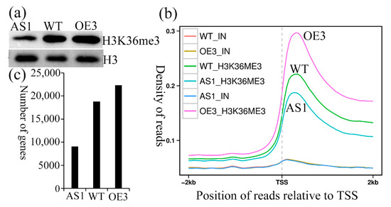 To evaluate the impact of SDG102 on global histone methylation patterns, Western blotting and ChIP-sequencing (ChIP-seq) using H3K36me3 antibodies were performed. The experiments were conducted on the ninth leaves collected from the V7 stage plants to compare the SDG102-knockdown and overexpression plants with the WT. Western blotting analysis indicated that the H3K36me3 levels were markedly reduced in AS1 and increased in OE3 compared to the levels in the WT (Figure 5a). The same trends were observed in the ChIP-seq analysis (Figure 5b). Interestingly, H3K36me3 in the WT, OE3, and AS1 was most abundant within the gene body regions near the transcription start site (TSS) regions. There were 22,351 gene loci in OE3, 18,799 gene loci in the WT, and 9059 gene loci in AS1 with H3K36me3, respectively (Figure 5c).