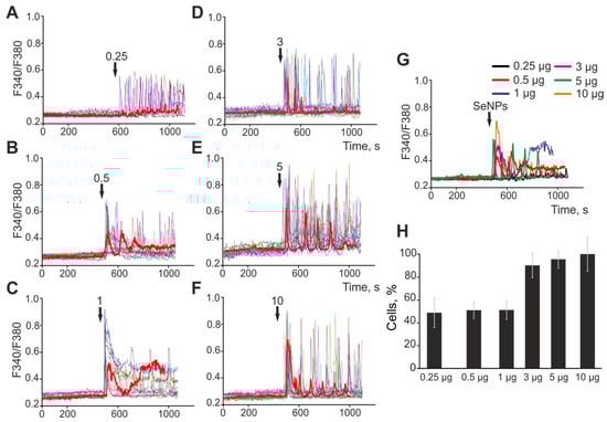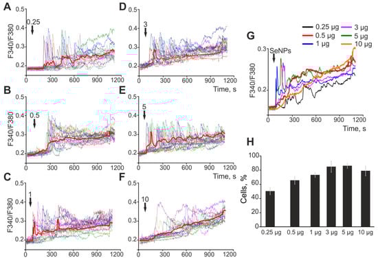 Application of various concentrations of 100 nm-sized SeNPs induces the generation of Ca2+ signals in astrocytes of the cerebral cortex. (A–F)—Ca2+ signals of individual astrocytes in one experiment and their average value (red curve) for the application of increasing concentrations of SeNPs. (G)—Astrocytic Ca2+ signals averaged over several tens of cells for the application of increasing concentrations of 100 nm-sized SeNPs. (H)—The percentage of astrocytes that respond with Ca2+ signals to the application of SeNPs. The arrow indicates the moment of SeNPs application and their concentration in micrograms per mL (μg/mL).