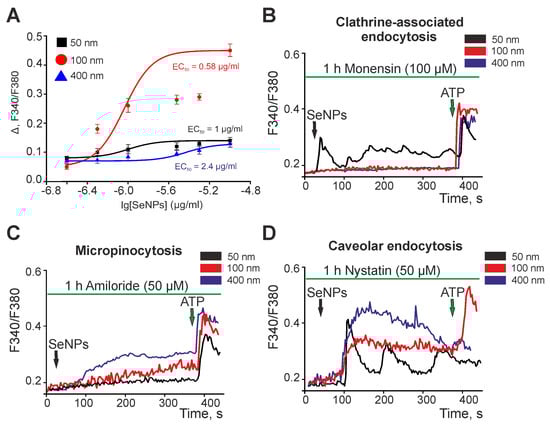 We have previously shown that SeNPs activate the Ca2+ signaling system of human glioblastoma cells by activating micropinocytosis and clathrin-associated endocytosis []. The application of SeNPs after incubation of astrocytes with monensin, a blocker of clathrin-associated endocytosis, resulted in suppression of the Ca2+ signals of cells with the addition of SeNPs with a diameter of 100 nm and 400 nm, while the signals for SeNPs with a diameter of 50 nm were preserved (Figure 4B). The application of different-sized SeNPs against the background of amiloride, a blocker of micropinocytosis, led to complete suppression of the Ca2+ signals of astrocytes with the addition of 50 nm-sized SeNPs, and the responses to the addition of large nanoparticles (100 nm and 400 nm) at least changed shape, ceasing to be transient or oscillatory, but were preserved (Figure 4C). The blocker of caveolar endocytosis, nystatin, did not affect the Ca2+ responses when SeNPs were added (Figure 4D), which may indicate that this endocytosis pathway does not affect the activation of the Ca2+ signaling system of cerebral cortex astrocytes.