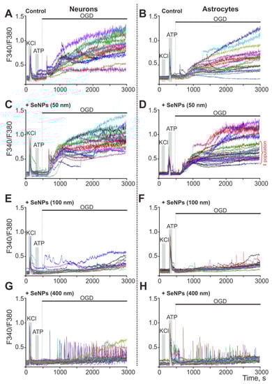 It is known that OGD conditions cause Ca2+-dependent damage to brain cells, which occurs as a result of a biphasic increase in Ca2+ ions in the cytosol of both neurons (Figure 7A) and astrocytes (Figure 7B). It is generally accepted that the second phase of the global increase in [Ca2+]i is precisely one of the causes of rapid cell death, which occurs as a result of impaired Ca2+ homeostasis. Preliminary (within 24 h) incubation of cerebral cortex cells with 3 μg/mL SeNPs (50 nm) does not lead to inhibition of the first and especially the second phase of the OGD-induced increase in [Ca2+]i in neurons (Figure 7C), but, among astrocytes, there is an increase in the number of cells with a lower level of [Ca2+]i (Figure 7D—II population). Pre-incubation of cells with 3 μg/mL SeNPs (100 nm) resulted in suppression of the first phase of the OGD-induced [Ca2+]i increase in most neurons and an almost complete inhibition of the global [Ca2+]i increase (Figure 7F). The same effect completely suppresses Ca2+ signals in astrocytes on OGD, and single Ca2+ pulses are preserved only in single cells (Figure 7F). The use of large SeNPs (400 nm) also leads to the suppression of the global growth of Ca2+ in the cytosol of neurons (Figure 7G) and astrocytes (Figure 7H), but, in both cell types, Ca2+ signals on OGD take the form of high-frequency Ca2+ oscillations, which in pathological conditions can be regarded as a sign of cell hyperexcitation [].