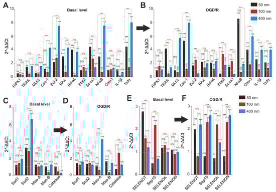 The effect of 24-h incubation of mouse cerebral cortex cells with 3 μg/mL of different-sized SeNPs on the baseline and OGD/R-induced expression levels of genes that regulate cell death, antioxidant status, and selenoproteins. (A,B)—Basal (A) and OGD/R-induced (B) levels of expression of genes encoding proteins of necrosis, apoptosis, and inflammation in brain cortex cells after 24-h incubation with 3 μg/mL of different-sized SeNPs. (C,D)—Basal (C) and OGD/R-induced (D) levels of expression of genes encoding protein-regulators of antioxidant status in brain cortex cells after 24-h incubation with 3 μg/mL of different-sized SeNPs. (E,F)—Basal (E) and OGD/R-induced (F) levels of expression of genes encoding selenoproteins after 24-h incubation with 3 μg/mL different-sized SeNPs. Gene expression in control cells are marked by dashed line for the (A,C,E) panels. Gene expression in OGD/R cells without SeNPs treatment are marked by dashed line for the (B,D,F) panels. Statistical significance was assessed using t-test. Comparison of experimental groups regarding control: n/s—data not significant (p > 0.05), * p < 0.05, ** p < 0.01 and *** p < 0.001. Comparison of experimental groups relative to each other is indicated in red or green. The number of RNA samples is 5.