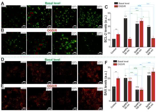 Immunocytochemical staining of cortical cell culture with antibodies against BCL-2 (A,B) and BAX (D,E), regulators of apoptosis, after 24-h incubation with 3 μg/mL of different-sized SeNPs without OGD/R (A,D) and 24 h after OGD/R (B,E). (C,F)—Intensity levels of BCL-2 (C) and BAX (F) were determined by confocal imaging. We analyzed individual cells that had fluorescence of secondary antibodies. The quantative data reflecting the level of BCL-2 or BAX expression are presented as fluorescence intensity values in summary bar charts (mean ± SEM). The values were averaged by 150 cells for each column. The results obtained after immunostaining agree with the data of fluorescence presented in panels (A,B,D,E). Each value is the mean ± SE (n ≥ 3, p < 0.05). Statistical significance was assessed using paired t-test. Black asterisks represent comparison of baseline expression levels after incubation with different sized nanoparticles versus control. Red asterisks represent comparison of expression level after incubation with different-sized SeNPs versus OGD/R-induced levels; n/s—data not significant (p > 0.05), * p < 0.05, ** p < 0.01, *** p < 0.001.