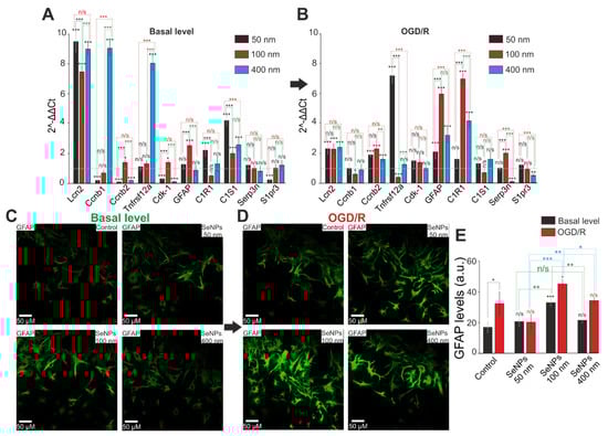 Previously, we have shown that SeNPs lead to OGD/R-induced reactive astrogliosis []. In this work, we investigated changes in the expression of ten genes encoding key proteins involved in astrocyte reactivation. It turned out that SeNPs with a diameter of 100 nm, after a 24-h incubation, cause an increase in the basic expression of five genes (Lcn2, Ccnb2, Cdk-1, GFAP, C1S1), and SeNPs 400 nm cause an increase in the expression of only four genes (Lcn2, Ccnb1, Tnfrsf12a, C1S1), whereas 50 nm SeNPs lead to a decrease in the baseline expression of four genes and an increase in the expression of only three (Lcn2, C1R1, C1S1) (Figure 11A). Interestingly, only the use of 100 nm SeNPs causes an increase in the expression of the gene encoding the key protein of reactive astrogliosis, GFAP, and this observation is confirmed by immunocytochemical staining of astrocytes (Figure 11C) in which the content of GFAP is higher by 25% only in the group treated with 3 µg/mL SeNPs 100 nm in diameter (Figure 11E).