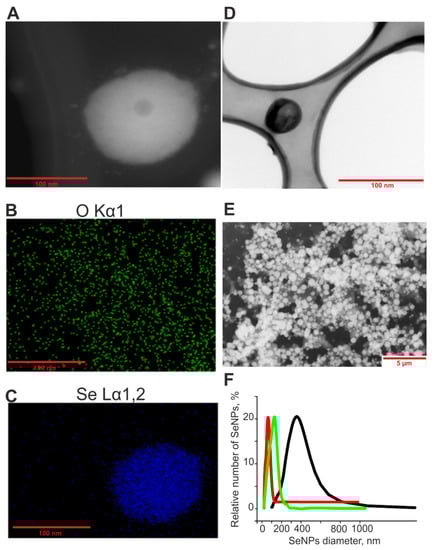 Shape, chemical composition, and size distribution of SeNPs. (A)—TEM image of an individual nanoparticle with a diameter of about 100 nm (dark field image). (B)—The distribution of oxygen atoms in panel (A). (C)—The distribution of selenium atoms in panels A. (D)—TEM image of an individual nanoparticle with a diameter of 50 nm (bright field image). (E)—TEM image of a preparation of nanoparticles with an average diameter of about 400 nm (dark field image). (F)—Size distribution of selenium nanoparticles – 50 nm-sized (red line), 100 nm-sized (green line) and 400 nm-sized (black line). Data obtained using an analytical disk centrifuge and confirmed by DLS. PDI50nm = 0.25 ± 0.3; PDI100nm = 0.29 ± 0.5; PDI400nm = 0.34 ± 0.8 (n = 3).