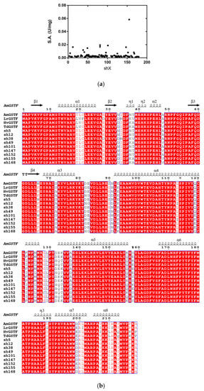 (a) Activity screening of colonies obtained by DNA shuffling. Only the colonies that displayed detectable activity with the substrate system CDNB/GSH are depicted. (b) Protein sequence alignment of parent GSTFs (NCBI accession numbers AmGSTF: CAA09192.1, LrGSTF: CCO25537.1, HvGSTF: AAL73394.1, TdGSTF: VAH13982.1) and selected variants obtained by DNA shuffling. Shaded areas displayed a similarity score value over 0.7 (0 to 1 range) based on their physicochemical properties. The letters are colored based on similarity using the “Thermal” option in ESPript 3.0 []. The secondary structure of AmGSTF (PDB code: 6RIV) is shown at the top. Alpha helices and beta strands are represented as helices and arrows, respectively. Beta turns are marked with TT. Initial alignment was accomplished by Clustal Omega [].