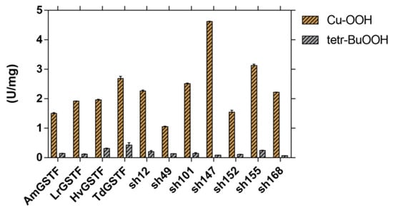 The purified enzymes were also assessed for glutathione-dependent peroxidase activity (Figure 2). It is well established that members of phi class GSTs [,,,] exhibit significant glutathione peroxidase activity towards cumene hydroperoxide. The parent GSTFs correspond to Ser-type GSTs, since their active site ancestral cysteine has been replaced by a Ser residue at position 12; thus, they display the STN motif (Ser12-Thr13-Asn14) in α1 helix of the G-site [,]. Ser-type GSTs exhibit high hydroperoxidase activity that contributes to their detoxifying role [] and has been associated with the MHR phenomenon by assisting in an antioxidant protective mechanism against toxic organic hydroperoxides, which are formed as a result of abiotic stress caused by herbicides [].