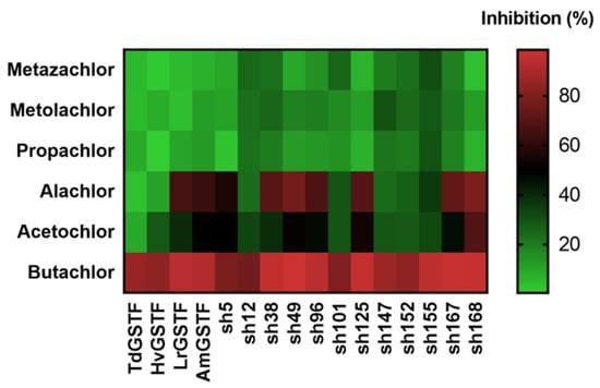Heat map depiction of the inhibition (%) of parent GSTFs (AmGSTF, LrGSTF, HvGSTF, TdGSTF) and shuffled enzyme variants (sh12, sh49, sh101, sh147, sh152, sh155, sh168) by chloroacetanilide herbicides (50 μM).