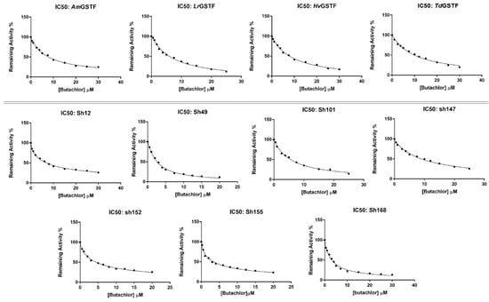 In order to assess the effect of recombination on the ligandin function of the enzyme variants, six different chloroacetanilide herbicides were tested as inhibitors (Figure 3). The results showed that between these herbicides, butachlor displayed substantial potency towards all the tested enzymes. Dose-response measurements allowed the determination of IC50 of butachlor towards all the enzymes []. The values estimated among the wild-type enzymes did not show significant differences in inhibition potency among weed (LrGSTF and AmGSTF) and crop (TdGSTF and HvGSTF) enzymes. However, it was estimated that sh49, sh155 and sh168 exhibited up to 3-fold lower IC50 values than the crop GSTFs (Table 2, Figure 4). This provides a significant prospect for utilization in several biotechnological applications and developments. For example, the enzyme variant sh155 could potentially be a promising candidate for the development of a butachlor biosensor, since it combines low IC50 values with high catalytic activity.