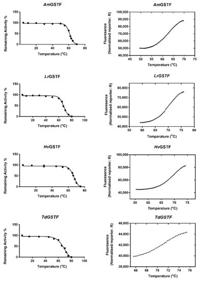 Thermal stability studies of the parent enzymes (AmGSTF, LrGSTF, HvGSTF, TdGSTF). Left column: thermal inactivation curves. The remaining enzyme activities (%) were measured after heat treatment of each enzyme at the indicated temperatures (°C) for 5 min. Right column: Differential scanning fluorimetry normalised curves for the determination of the melting temperature (Tm). The measurements were performed in triplicate and the data represent the mean ± SD (N = 3).
