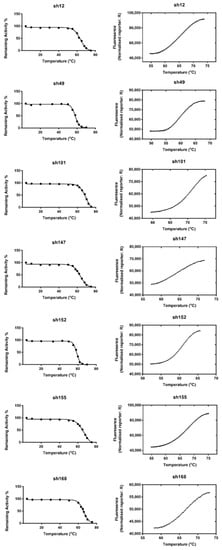 Thermal stability studies of the DNA shuffled enzyme variants (sh12, sh49, sh101, sh147, sh152, sh155, sh168). Left column: thermal inactivation curves. The remaining enzyme activities (%) were measured after heat treatment of each enzyme at the indicated temperatures (°C) for 5 min. Right column: Differential scanning fluorimetry normalised curves for determination of the melting temperature (Tm). The measurements were performed in triplicate and the data represent the mean ± SD (N = 3).