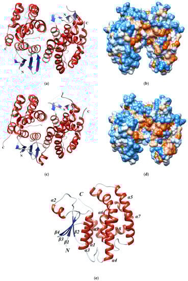 Crystal structure of the sh101 and sh155 enzyme variants. (a,c) Ribbon representation of the dimer protein (sh101 and sh155, respectively). The α-helixes (red) and β-strands (blue) are depicted. (b,d) Surface hydrophobicity of the homodimer protein. Hydrophilic areas are shaded in a blue color range and hydrophobic areas in an orange-red color range. The figures were created by UCSF Chimera []. (e) Ribbon representation of the monomer of sh155 variant. The α-helixes (red) and β-strands (blue) are labelled.