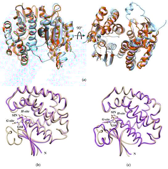 (a) Superposition of the sh101 (dark orange) and sh155 (blue) dimeric structures. The letter N represents the N-terminal site. (b) Superposition of the monomers of sh101 (purple) and AmGSTF (PDBid 6riv) (beige). The succinic acid (SIN) and glutathione sulfenic acid (GS8) molecules bound to the AmGSTF structure are shown as sticks and colored according to the atom type. (c) Superposition of the monomers of sh155 (purple) and AmGSTF (beige). The succinic acid (SIN) and glutathione sulfenic acid (GS8) molecules bound to the AmGSTF structure are shown as sticks and colored according to the atom type.