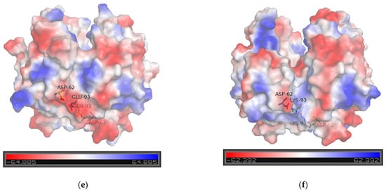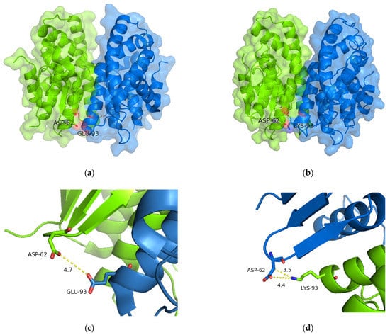 Amino acid residue at position 93 in AmGSTF (Glu93; (a,c,e)) and sh101 (Lys; (b,d,f)), which is involved in the formation of a new salt bridge with Asp62 of the opposite subunit. (e,f) Electrostatic surface of the dimers is depicted with 50% transparency. The figures were created with PyMol [].
