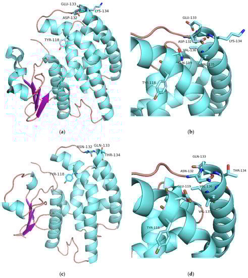 (a) Ribbon representation of the AmGSTF monomer, showing the motif Asp-Glu-Lys in relation to Tyr118. (b) Amino acid residues in AmGSTF that contribute towards inhibition sensitivity by butachlor. (c) Ribbon representation of the monomer of sh155 variant, showing the Asn-Gln-Thr motif. (d) Amino acid residues in sh155 variant that contribute towards inhibition sensitivity by butachlor. The figures were created by PyMol [].