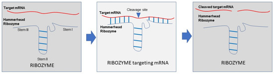 General concepts: Ribozymes are RNA molecules that are characterized by catalytic activity such as proteins. They are able to cleave target RNAs and thus impact gene expression [63] and allow gene manipulation. This class of molecules is characterized by two domains: one is the sequence that recognizes a region of the target RNA by base complementarity, and the other is the catalytic domain [64]. The best-characterized and studied are the hammerhead ribozymes. The minimal sequence of these ribozymes consists of a well-conserved core region of fifteen nucleotides that are flanked by three stems with a helical structure, and their activity requires an interaction between specific sequences on the first and second stem [65]. Their folding allows their catalytic function (splicing or cleavage of other RNA molecules) in a sequence-specific manner through base-annealing of the ribozyme sequence with the regions flanking the cleavage site of the target RNA (Figure 1).