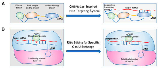 This approach has been applied at present to Adenosine deaminase acting on RNA (ADAR)-mediated RNA editing and has inspired further programmable RNA-guided machines for potential translational applications. In this regard, ADAR-mediating RNA editing, such as CIRTS (CRISPR-Cas-inspired RNA targeting system); RESCUE (RNA editing for specific C to U exchange); RESTORE (recruiting endogenous ADAR to specific transcripts for oligonucleotide-mediated RNA editing); and LEAPER (leveraging endogenous ADAR for programmable editing of RNA) have been developed and validated. The CIRTS system (Figure 2A) is composed of a gRNA, an ssRNA-binding protein, and a hairpin RNA-binding protein, which is linked to an effector protein such as the human adenosine deaminase for the transcripts containing G to A mutations in order to correct them. RESCUE (Figure 2B) is composed of a dead Cas13 (non-catalytic Cas13) that is fused to the human deaminase domain of ADAR2 in order to induce RNA editing. RESTORE (Figure 2C) is formed by a modified ASO with a domain that gives specificity to target RNA and a domain of recruitment of endogenous ADAR enzymes. LEAPER (Figure 2D) is a strategy that is composed of an ADAR-recruiting RNA that anneals with the target transcripts with an A-C mismatch, and the double-stranded substrate is recognized by the ADAR1 enzyme [74]. All of these approaches could be applied to correct RNA level point mutations (G-A) that occur at genomic sites and that are causative of disease onset.